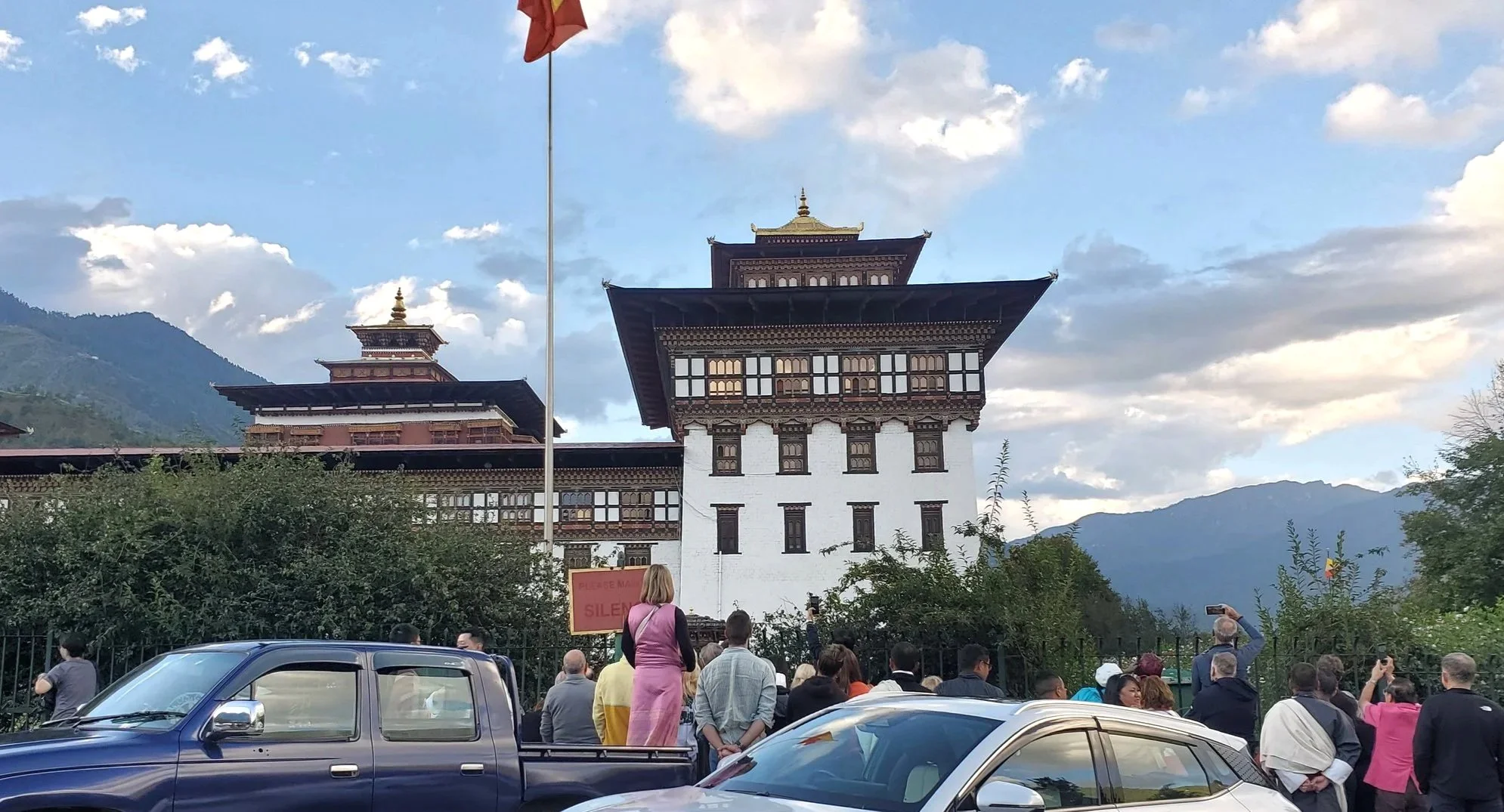 We then drove the 54 km from Paro to Thimphu just in time to visit the Tashichho dzong, the seat of the national government and the central monastic body. We arrived just in time to see the ceremonial lowering of the national flag.