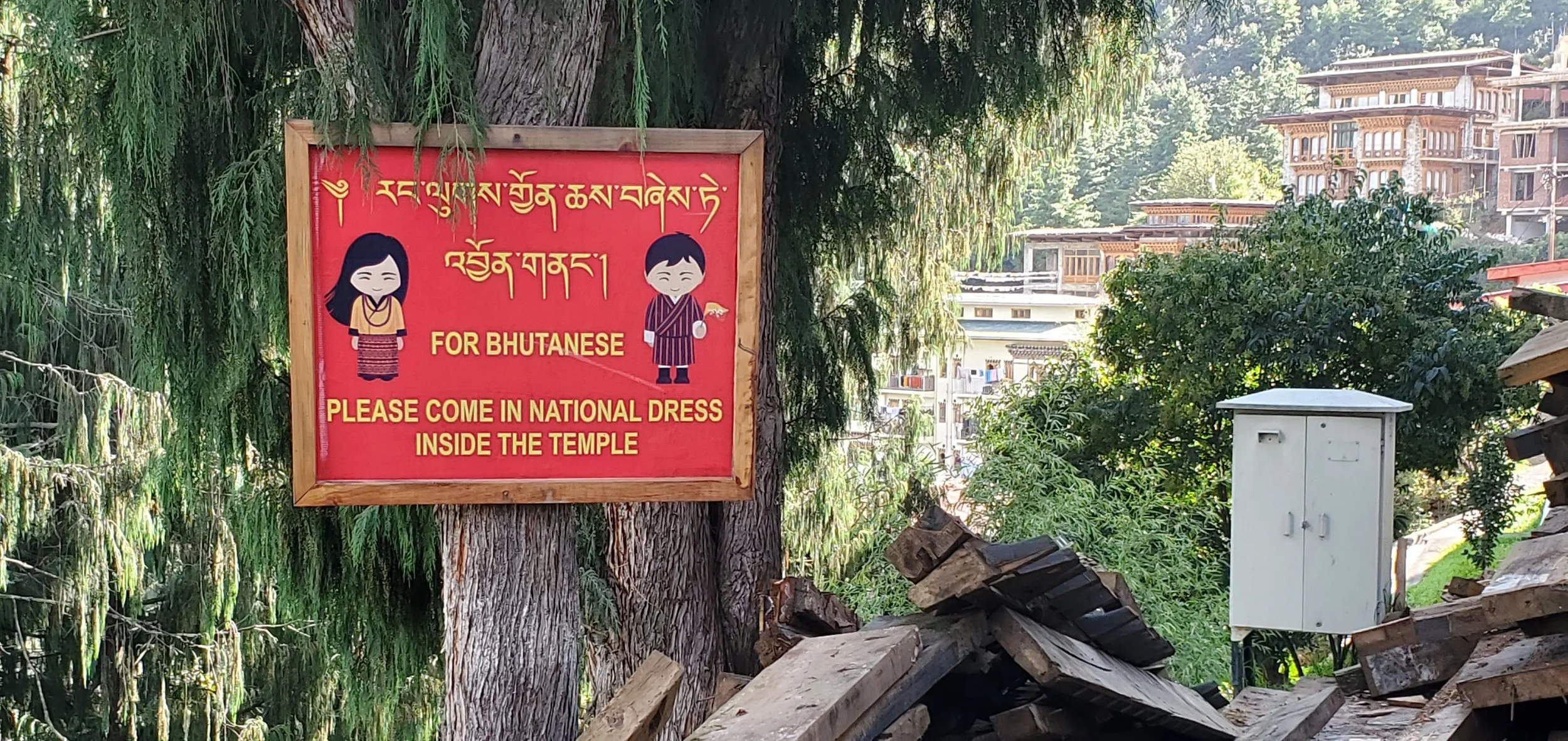 Bhutanese citizens are required to wear national dress in all temples and government buildings. In reality the vast majority of locals appear to wear their national dress most of the time. For the men it is called a gho and for the women the kira.