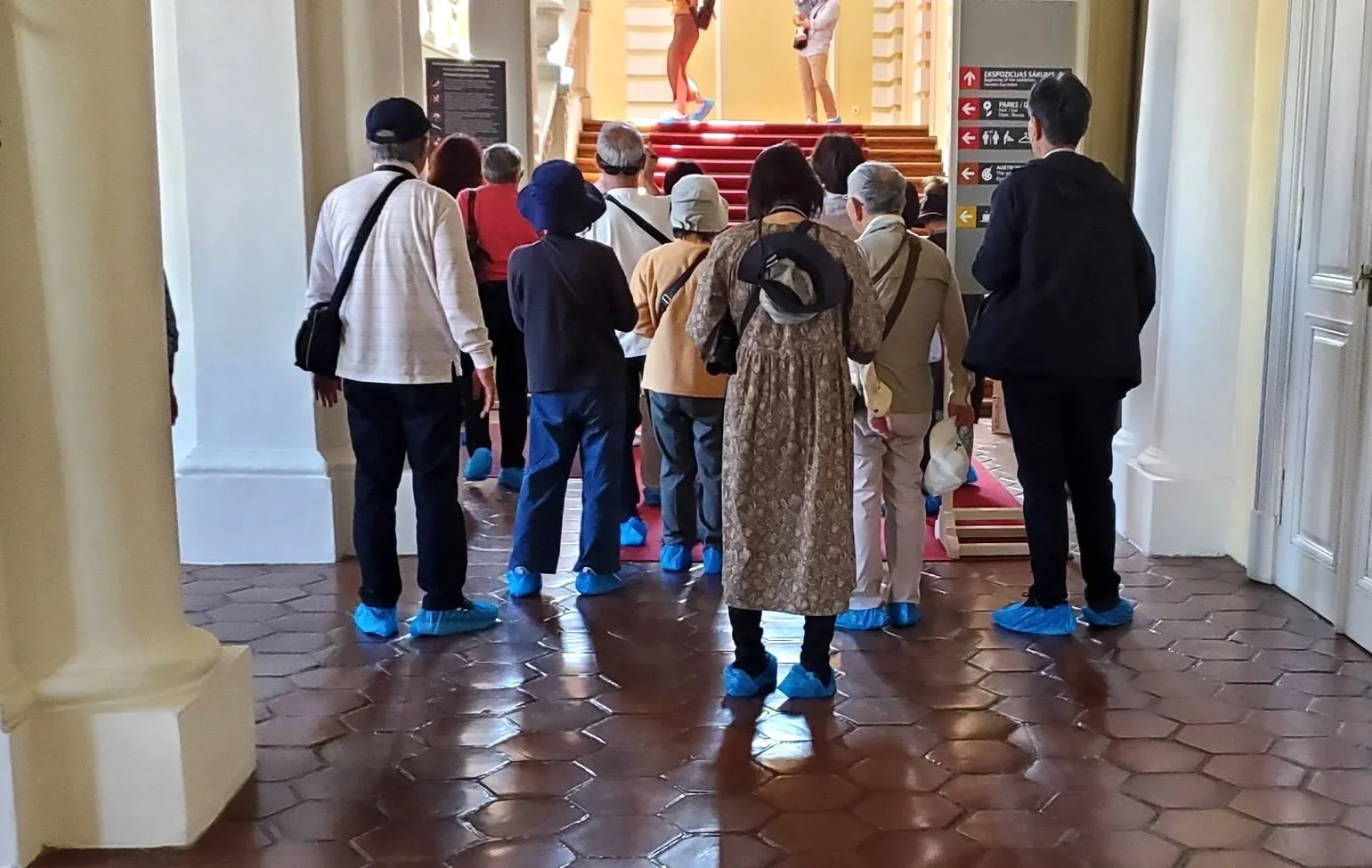 Visitors are adorned with attractive blue shoe covers to protect the floors.