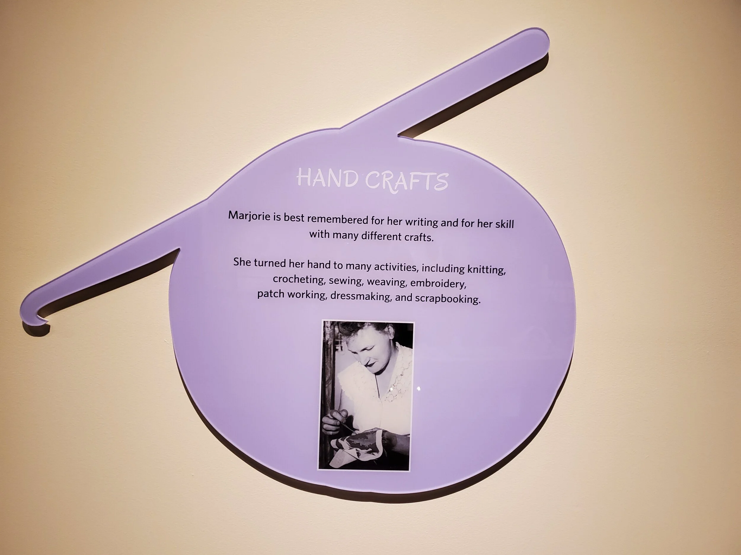 The themes of the exhibition were: Who was Marjorie?; Matrimony; In the Community; Home Maker; Hand Crafts; Recycler; Author; Collector; 'Gallivanting'; Remembering Marjorie.